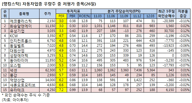 이 가운데 에코플라스틱3,055원, ▲95원, 3.21%은 PER이 3배로 자동차 업종 우량주 중에서 가장 낮았다. ROE는 12.8%, PBR은 0.38배다.