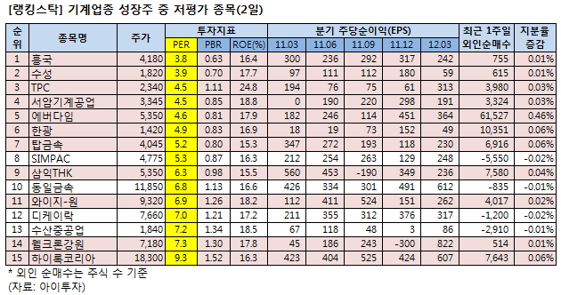이 가운데 흥국5,100원, ▲40원, 0.79%의 PER이 3.8배로 기계업종 성장주 중에서 가장 낮았다. ROE는 16.4%, PBR은 0.63배다.