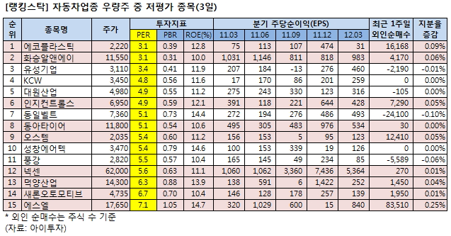 이 가운데 에코플라스틱3,065원, ▲105원, 3.55%은 PER이 3.1배로 자동차 업종 우량주 중에서 가장 낮았다. ROE는 12.8%, PBR은 0.39배다.