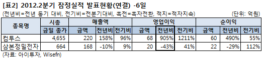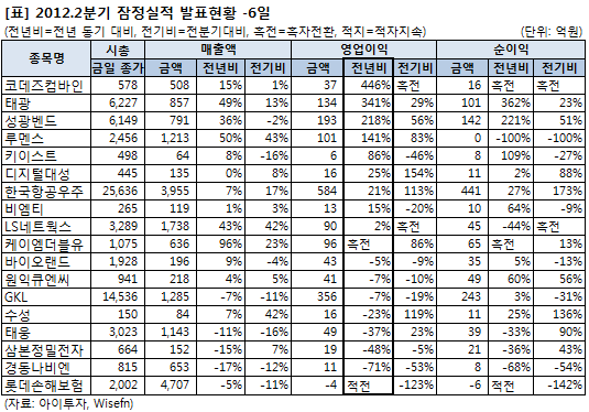 6일 오후 4시 30분 현재 2012년 2분기 잠정실적을 발표한 기업의 매출액, 영업이익, 순이익 금액과 성장률을 아이투자가 정리했다.