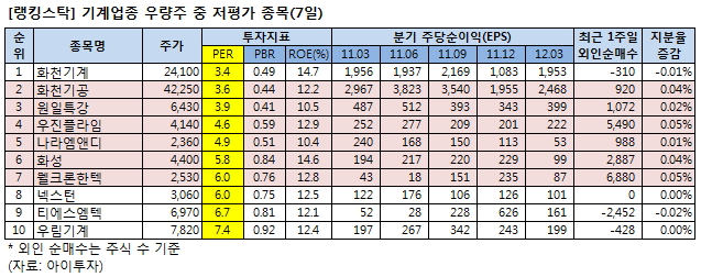 기계 업종 우량주의 기준은 기계 업종 주식 가운데 ROE(자기자본이익률)가 10~15% 이내이고, PBR(주가순자산배수)이 1.5배 미만인 종목들이다. 이런 기준으로 선정한 10개 종목은 모두 PER이 3.4배~7.4배 사이에 해당됐다. 연결 지배지분 또는 지분법이 적용된 순이익과 자본을 적용해 투자지표를 산출했다.