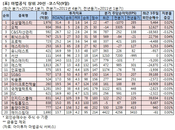 오성엘에스티는 ROA 31.4%로 8위, PER 1.6배로 14위를 기록해 합계 점수 22점으로 1위를 차지했다. 그외 오텍1,744원, ▲9원, 0.52%, {C&S자산관리}, 휘닉스소재, 프로텍33,100원, ▲300원, 0.91%, 에스티아이24,750원, 0원, 0%, 유니테스트14,340원, ▼-160원, -1.1%, 서산1,480원, ▼-9원, -0.6%, 에스에이티1,283원, ▲22원, 1.74%, 에스맥이 코스닥 상위 10선에 포함됐다. 연결 지배지분 또는 지분법이 적용된 순이익과 자본을 적용해 투자지표를 산출했다.