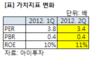 2분기 실적을 반영해 주가수익배수(PER)는 3.8배에서 3.4배로 낮아졌다. 주가순자산배수(PBR)는 0.4배로 동일하며, 자기자본이익률(ROE)은 10%에서 11%로 높아졌다.