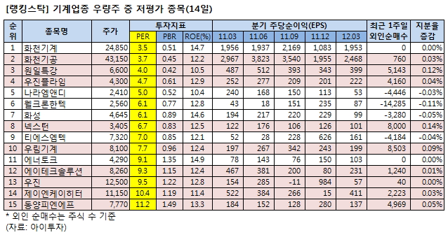 기계 업종 우량주 중에서 PER(주가수익배수) 기준으로 가장 저평가된 종목은 화천기계4,595원, ▲60원, 1.32%로 나타났다. 이는 지난 14일 종가 기준, 기계업종 우량주 중 대표적인 저평가 지표인 PER이 낮은 종목 15개를 선정한 결과에 따른 것이다.