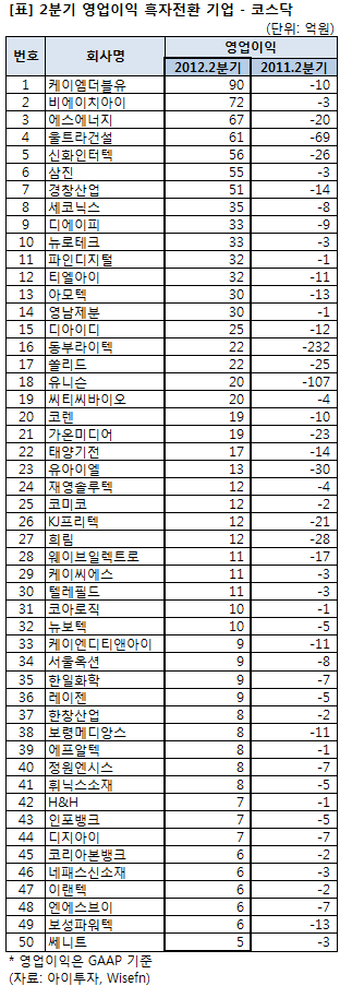 지난 14일까지 반기보고서를 발표한 코스닥 상장 기업 중 2분기 영업이익이 전년 동기 적자에서 흑자로 전환한 기업을 아이투자가 16일 정리했다. 모두 83개 기업이 이에 해당했다. 그 중 영업이익 규모가 큰 상위 50개 기업을 아래 표로 정리했다. 케이엠더블유14,800원, ▲330원, 2.28%의 2분기 영업이익이 90억원으로 가장 컸다. 같은 기준으로 비교하기 위해 영업이익은 종전 회계기준(GAAP)을 사용했다. GAAP 기준 영업이익은 매출총이익에서 판관비를 빼서 계산한다.