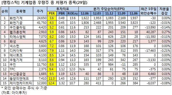 기계 업종 우량주의 기준은 기계 업종 주식 가운데 ROE(자기자본이익률)가 10~15% 이내이고, PBR(주가순자산배수)이 1.5배 미만인 종목들이다. 이런 기준으로 선정한 15개 종목은 모두 PER이 3.6배~12.4배 사이에 해당됐다. 연결 지배지분 또는 지분법이 적용된 순이익과 자본을 적용해 투자지표를 산출했다.