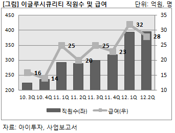 공공 보안관제 제도가 도입되기 전 이글루시큐리티는 시장 선점을 위해 대규모 투자를 단행했다. 보안관제가 인력 파견 서비스이니 만큼 전문 인력을 대거 채용했다. 지난 2010년 9월 말 직원수는 225명에 불과했지만, 지난해 말 318명으로 41% 늘었다. 지난해 매출액이 16% 증가했음에도 이익이 감소한 이유로 보인다. 직원을 대거 채용하면서 급여가 34억원 가량 늘어난 까닭이다. 이글루시큐리티의 올해 6월 말 직원수는 396명으로 계속해서 증가하고 있다.
