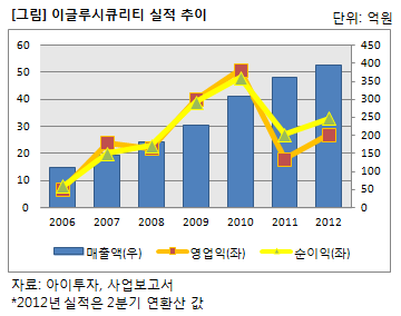이같은 경쟁력을 바탕으로 이글루시큐리티는 꾸준히 매출 성장을 이뤘다. 지난 2006년 매출액은 111억원에 불과했지만, 지난해 362억원으로 두 배 넘게 증가했다. 5년간(2006년~2011년) 연평균 매출액 성장률은 27%다.