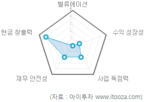 다만 소비자 독점력이 낮아 산업내 경쟁이 심화되면 수익성이 하락할 가능성이 있다. 재무 안전성도 2점으로 낮다. 이는 현금회전일수가 141일로 120일을 초과하고, 부채비율이 160%로 100%를 넘으며, 이자보상배율이 1배로 2배 미만인 점이 반영된 결과다. 아이투자는 현금회전일수 120일 이하, 이자보상배율이 2배 이상을 재무가 안전한 조건 중 하나로 보고 있다. 또한, 밸류에이션 매력도 0점으로 낮다. 이는 올해 상반기 순이익 적자로 2분기 연환산(최근 4분기 합산) 기준 주가수익배수와 자기자본이익률이 마이니스로 전환했지만, 주가순자산배수는 여전히 5년 평균과 거의 같은 2.6배에 거래되고 있는 점이 반영된 결과다. |