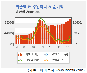 주가 급등락과는 대조적으로 대한제강은 올 상반기 안정적인 실적 회복세를 보였다. 상반기 매출액은 5386억원으로 지난해 동기보다 32% 늘었고, 영업이익과 순이익은 280억원과 202억원으로 각각 330%와 481%가 늘었다.