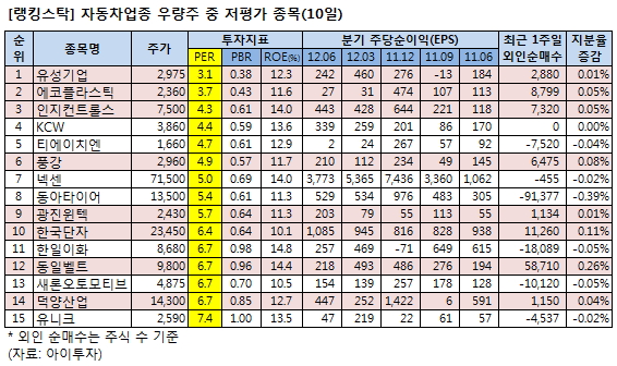 자동차 업종 우량주 중에서 PER(주가수익배수) 기준으로 가장 저평가된 종목은 유성기업2,020원, ▲36원, 1.81%으로 나타났다. 이는 지난 10일 종가 기준, 자동차 업종 우량주 중 대표적인 저평가 지표인 PER이 낮은 종목 15개를 선정한 결과에 따른 것이다.