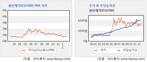 한편 환인제약 주가는 지난해부터 주당순자산 밑에서 거래되고 있다. 주가순자산배수(PBR)가 1배 미만인 경우는 지난 2004년 이후 처음이다. 이 가운데 환인제약의 이원범 대표는 회사 지분을 늘렸다. 이 대표는 지난달 28일(변동일 기준)부터 이달 4일까지 총 6만주를 장내 매수했다. 매수 단가는 6488원에서 6598원 사이다. 이 대표의 지분율은 1.18%에서 1.5%로 늘었다. 최대주주는 부친인 이광식 씨(특수관계인 포함)로 37.81%이다.