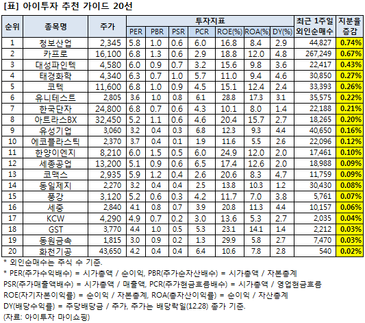 아래 리스트는 아이투자 추천 가이드 요건을 만족하는 종목을 골라낸 후 이를 최근 1주일간 외국인 보유 지분증가율이 높은 순으로 정렬한 것이다.