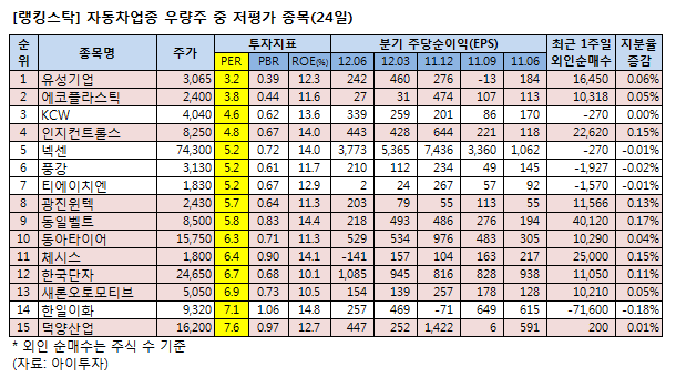 자동차 업종 우량주 중에서 PER(주가수익배수) 기준으로 가장 저평가된 종목은 유성기업2,020원, ▲36원, 1.81%으로 나타났다. 이는 지난 24일 종가 기준, 자동차 업종 우량주 중 대표적인 저평가 지표인 PER이 낮은 종목 15개를 선정한 결과에 따른 것이다.