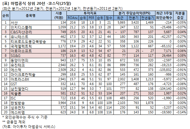 서산은 ROA 20.6%로 18위, PER 1.8배로 3위를 기록해 합계 점수 21점으로 1위를 차지했다. 이외 인지디스플레1,342원, ▼-10원, -0.74%, {C&S자산관리}, 유니테스트14,340원, ▼-160원, -1.1%, 티브로드도봉강북방송, 국제엘렉트릭, 아로마소프트, SG&G1,864원, ▲7원, 0.38%, 동양이엔피24,250원, ▲250원, 1.04%, 유진테크78,100원, ▲900원, 1.17%가 코스닥 상위 10선에 포함됐다. 전일 9위였던 마이크로컨텍솔이 1.4% 상승해 12위로 내려갔다. 유진테크가 새로 10위로 진입했다.
