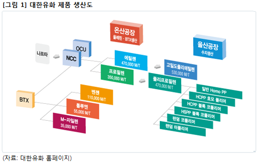 대한유화는 지난 1970년 설립돼 1972년 국내 최초로 플라스틱(합성수지)의 원재료인 폴리프로필렌(PP) 생산 공장을 설립한 화학업체다. 현재 울산, 온산 석유화학단지에 공장을 보유하고 있으며, 온산공장에서는 폴리프로필렌의 원료를 생산하고 있다. 울산공장에서는 합성수지를 생산한다. 즉, 나프타 분해에서 합성수지 생산에 이르는 수직 계열화된 생산시설을 갖추고 있다. 상반기 매출 비중은 합성수지 61%, 기초 원재료(프로필렌, 에틸렌 등) 36%다.