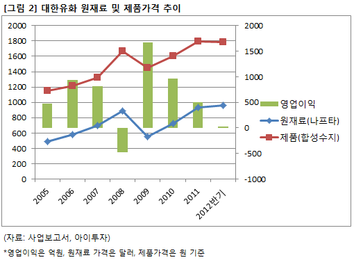 지난 2008년에도 대한유화는 원재료 가격상승에 따른 실적 부진을 겪었다. 477억원의 영업 적자를 기록한 것. 하지만 이듬해인 2009년에는 상승했던 원재료 가격이 하락하며, 영업이익이 크게 개선돼 사상 최대치인 1672억원을 기록한 바 있다. 앞으로의 실적도 스프레드 영향을 받을 것으로 보인다.