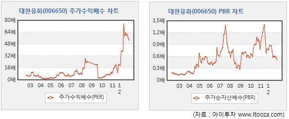 최근 대한유화 주가는 지난 2011년 사상 최고가인 17만5000원의 1/3 수준인 6만원대에 거래되고 있다. 증권가에 따르면 지난 8일 장중 6만원으로 52주 최저가를 기록하기도 했다. 최근 지표는 실적 부진으로 PER이 높아진 가운데 주가 하락으로 PBR은 낮아진 것으로 풀이된다.