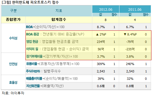 아이투자에서 개발한 '피오트로스키 점수판'에 따르면 한미반도체의 2분기 피오트로스키 점수는 8점으로 전년 동기보다 4점 올랐다. 총 9개 평가항목 중에서 8개 항목이 개선됐다는 의미다. 항목별로는 수익성 부문에서 3점을 추가 취득했으며, 안전성 부문에서도 1점이 더 올랐다.