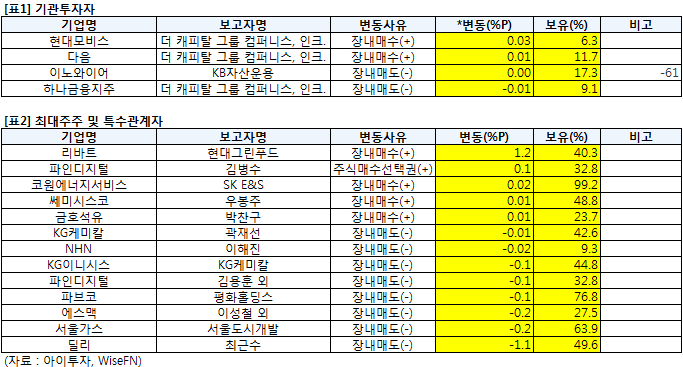 한편, 현대리바트6,110원, ▼-20원, -0.33%, 파인디지털3,285원, ▲70원, 2.18%, 코원에너지서비스 등에서는 최대주주 또는 특수관계자의 지분 변동이 있었다.