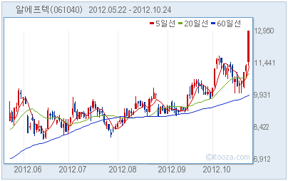 25일 개장을 앞둔 가운데 알에프텍이 강세를 이어갈지 관심을 끈다. 전일 알에프텍2,250원, ▲45원, 2.04%은 가격 제한폭까지 오늘 1만2950원으로 마감, 5일(거래일 기준) 연속 올랐다. 지난 18일부터 전일까지 알에프텍 주가는 25% 상승했다.