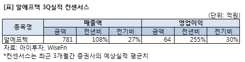 증권가는 알에프텍의 3분기 사상 최대 실적을 거둘 것으로 보고 있다. 지난달 27일 한양증권은 ▲ 갤럭시S3용 DMB 안테나 물량 증가 ▲ 갤럭시S3용 충전기 부품의 납품 단가 인상 ▲ 갤럭시노트2용 DMB 안테나 초도 물량 증가 등을 실적 개선의 원인으로 꼽았다. 최근 3개월 간 증권사가 전망한 알에프텍의 3분기 매출액 평균치는 781억원, 영업이익은 64억원이다. 이는 전년 동기 대비 각각 108%, 255% 늘어난 수치다.