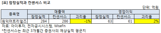 이는 증권사에 예상치에 부합하는 수준이다. 최근 3개월 간 증권사가 전망한 원익머트리얼즈의 3분기 매출액 평균치는 286억원, 영업이익은 61억원이다. 매출액은 예상치보다 1% 낮게 나왔으며, 영업이익은 2% 높게 나왔다.