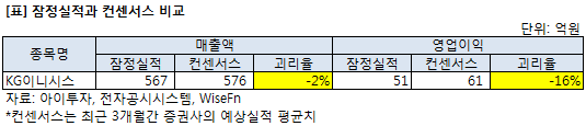 KG이니시스의 잠정 실적은 증권사의 예상치를 밑돌았다. 최근 3개월 간 증권사가 전망한 KG이니시스의 3분기 매출액 평균치는 576억원, 영업이익은 61억원이다. 잠정 매출액이 예상치보다 2%, 영업이익은 16% 낮게 나왔다.