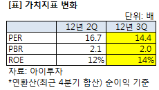 3분기 실적을 반영해 주가수익배수(PER)는 종전 16.7배에서 14.4배로 낮아졌다. 주가순자산배수(PBR)는 2.1배에서 2배로 낮아졌으며, 자기자본이익률(ROE)은 12%에서 14%로 올랐다. PER과 ROE는 연환산(최근 4분기 합산) 순이익 기준이다.