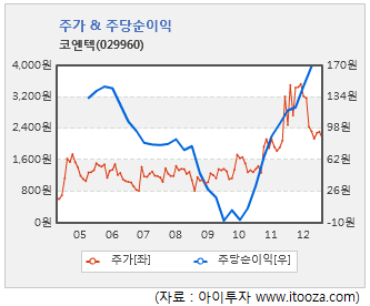 그러나 주가는 지난해 12월 15일 1년 중 가장 높은 가격인 4420원을 형성한 이후 꾸준히 하락, 최근엔 2000원 초반대에서 횡보하고 있다. 현재 주가는 신고가 대비 51% 내린 상태다.