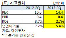 이 회사의 3분기 실적을 반영한 주가수익배수(PER)는 14.4배로 종전 10.6배보다 높아졌다. 주가순자산배수(PBR)는 0.4배, 자기자본이익률(ROE)은 2.7%로 산정됐다.