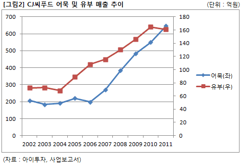 CJ씨푸드는 CJ계열사로 편입된 2년 후인 2008년 9월 부산어묵 생산라인 1개를 증설했다. 이어 지난해엔 국내 최초로 비유탕어묵 생산라인을 도입하고, 김 가공업체인 우성(올해 1월 흡수합병)을 인수했다. 올해 9월엔 비유탕어묵 생산라인을 다시 증설했다.