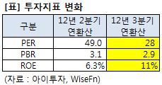 순이익 증가로 투자지표도 개선됐다. 3분기 연환산 기준(최근 4개 분기 합산) 현재 주가수익배수(PER)는 28배로 2분기 연환산 기준 49배보다 낮아졌다. 3분기 주당순자산(BPS) 기준 주가순자산배수(PBR)도 2.9배로 3분기 기준 3.1배보다 낮아졌다. 자기자본이익률(ROE)은 종전 5%에서 11%로 6%포인트 높아졌다.