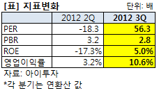 이번 3분기 실적을 반영한 연환산(최근 4개 분기 합산) 기준 주가수익배수(PER)는 56배로 산정됐다. 주가순자산배수(PBR)는 2.8배, 자기자본이익률(ROE)은 5%다.
