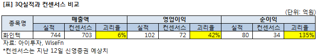 3개 분기 연속 순손실을 기록하다 흑자로 돌아선 지난 2분기의 개선세를 이어간 것이다. 이번 실적은 증권가 예상치를 상회한 수준으로, 지난 12일 신영증권은 보고서에서 화인텍의 매출액을 703억원으로 전망했다. 영업이익과 순이익은 발표치보다 42%와 135% 낮은 72억원, 34억원으로 예상했다. (아래 표 참조)