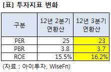 한편, 양호한 3분기 실적에 덕분에 투자지표도 개선됐다. 3분기 연환산 기준 현재 주가수익배수(PER)는 23배로 2분기 연환산 기준 25배보다 낮아졌다. 3분기 자본총계 기준 주당순자산(PBR)도 3.7배로 2분기 기준 3.8배보다 낮아졌다. 자기자본이익률(ROE)은 종전 15.5%에서 16.2%로 높아졌다. 지난 2009년 상장 후 3년여간 PER 평균은 13배, PBR 평균은 2.1배이고, 자기자본이익률(ROE) 평균은 15.7%다.