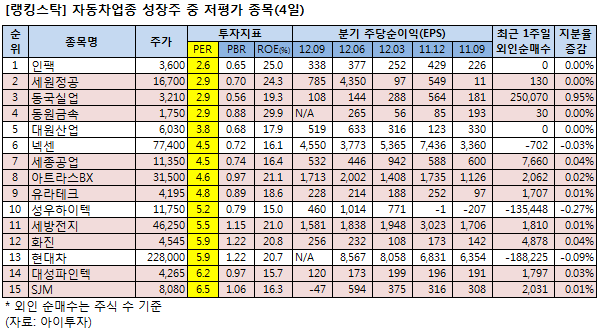 이 가운데 인팩6,080원, ▼-90원, -1.46%은 PER이 2.6배로 자동차 업종 성장주 중에서 가장 낮았다. ROE는 25.0%, PBR은 0.65배다.