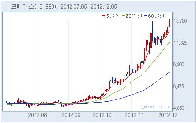 코스닥 지수가 1% 넘게 하락하는 가운데 모베이스3,100원, ▲75원, 2.48%가 사상 최고가를 기록했다. 5일 장중 1만3900원으로 10일 만에 최고가를 경신했다. 오후 2시 19분 현재 주가는 장중 고가 대비 2.1% 내린 1만3600원에 거래 중이다. 이는 전일 대비 4.6% 오른 것이다.