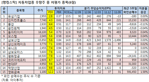 이 가운데 유성기업2,020원, ▲36원, 1.81%은 PER이 2.8배로 자동차 업종 우량주 중에서 가장 낮았다. ROE는 13.5%, PBR은 0.37배다.