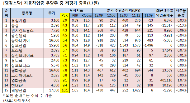 이 가운데 유성기업2,020원, ▲36원, 1.81%은 PER이 2.9배로 자동차 업종 우량주 중에서 가장 낮았다. ROE는 13.5%, PBR은 0.39배다.