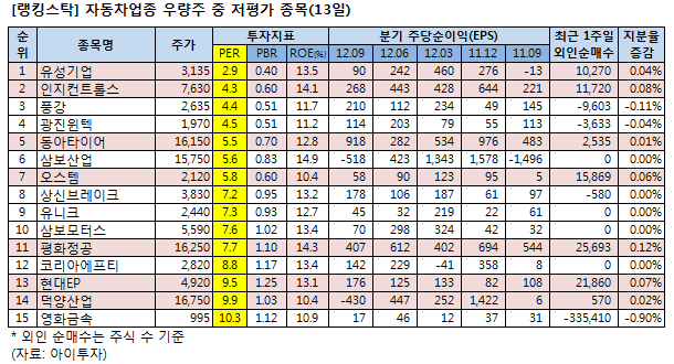 이 가운데 유성기업2,020원, ▲36원, 1.81%은 PER이 2.9배로 자동차 업종 우량주 중에서 가장 낮았다. ROE는 13.5%, PBR은 0.40배다.