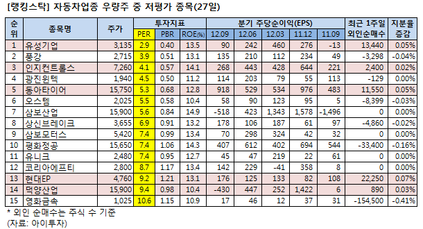 자동차 업종 우량주 중에서 PER(주가수익배수) 기준으로 가장 저평가된 종목은 유성기업2,020원, ▲36원, 1.81%으로 나타났다. 이는 지난 27일 종가 기준, 자동차 업종 우량주 중 대표적인 저평가 지표인 PER이 낮은 종목 15개를 선정한 결과에 따른 것이다.
