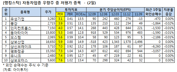 이 가운데 유성기업2,020원, ▲36원, 1.81%은 PER이 3.1배로 자동차 업종 우량주 중에서 가장 낮았다. ROE는 13.5%, PBR은 0.41배다.