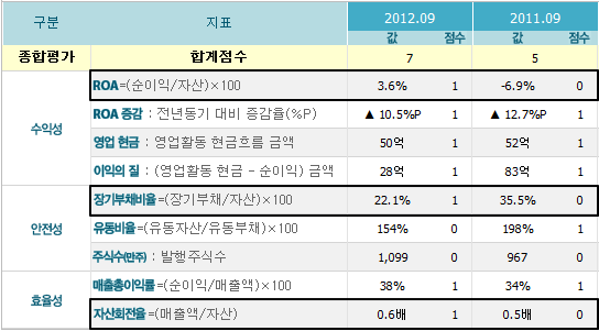 * 매출액, 영업이익, 순이익은 2012년 1월~9월 누적, 단위는 억원, K-IFRS 개별 재무제표 기준.