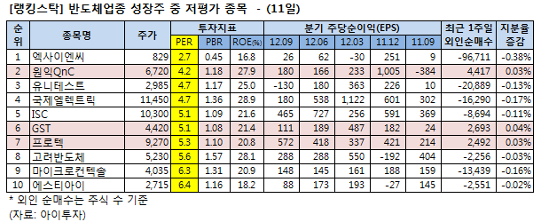 이 가운데 엑사이엔씨649원, ▲2원, 0.31%의 PER이 2.7배로 반도체업종 성장주 중에서 가장 낮았다. ROE는 16.8%, PBR은 0.45배다.