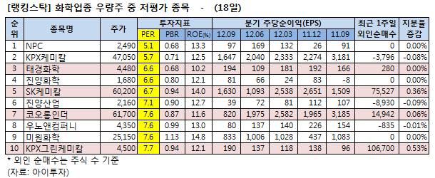 이 가운데 NPC3,850원, ▲25원, 0.65%의 PER이 5.1배로 화학 업종 우량주 중에서 가장 낮았다. ROE는 13.3%, PBR은 0.68배다.