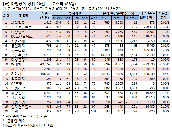 거래소에 상장된 기업 중에서 마법공식 종합순위 1위에 오른 종목은 세원정공12,000원, ▼-20원, -0.17%으로 나타났다. 이는 지난 28일 종가로 결정된 순위에 따른 것이다.
