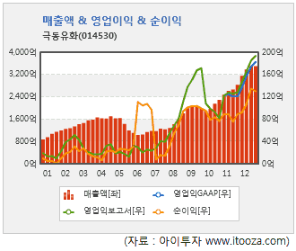공시 기준으로 가장 최근 분기인 지난해 3분기 극동유화의 누적 매출액은 2534억원으로 전년 동기보다 16% 늘었다. 영업이익은 153억원으로 45% 늘고, 순이익은 102억원으로 59% 늘었다.