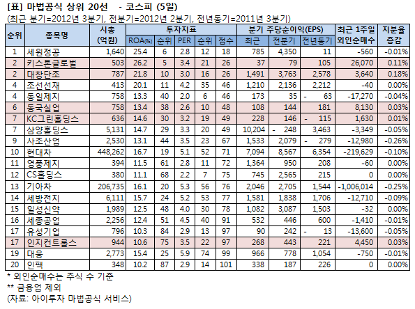 세원정공12,000원, ▼-20원, -0.17%은 ROA 25.4%로 6위, PER 2.8배로 12위를 기록해 합계 점수 18점으로 1위를 차지했다.