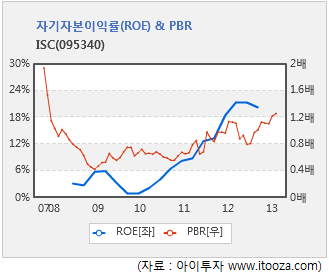 한편, ISC의 지난해 3분기 자본총계와 연환산 기준 순이익(최근 4개 분기 합산)을 적용한 자기자본이익률(ROE)은 20%, 주가순자산배수(PBR)는 1.2배다. 아직 자회사 손익을 포함한 지난해 4분기 순이익을 발표하지 않아 3분기 실적을 사용했다.
